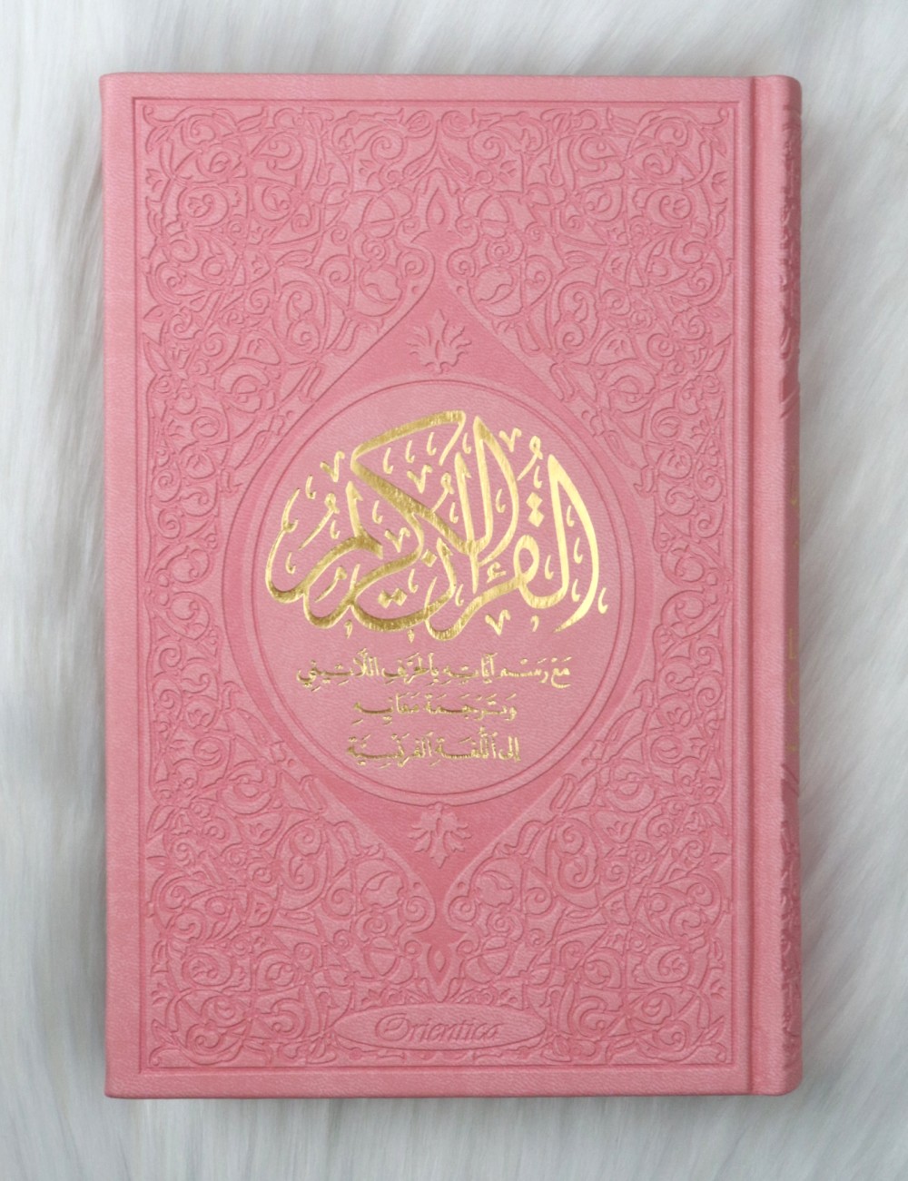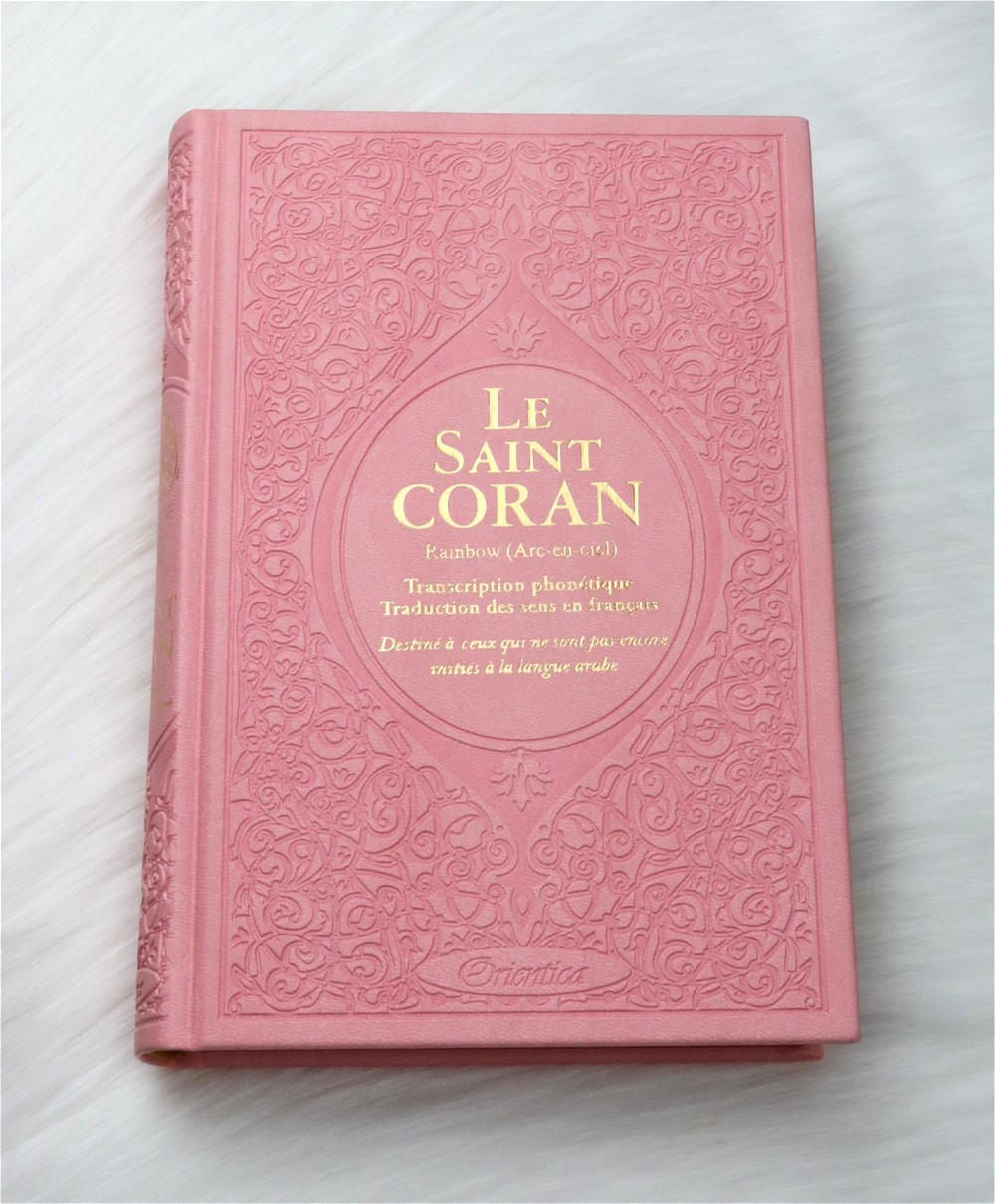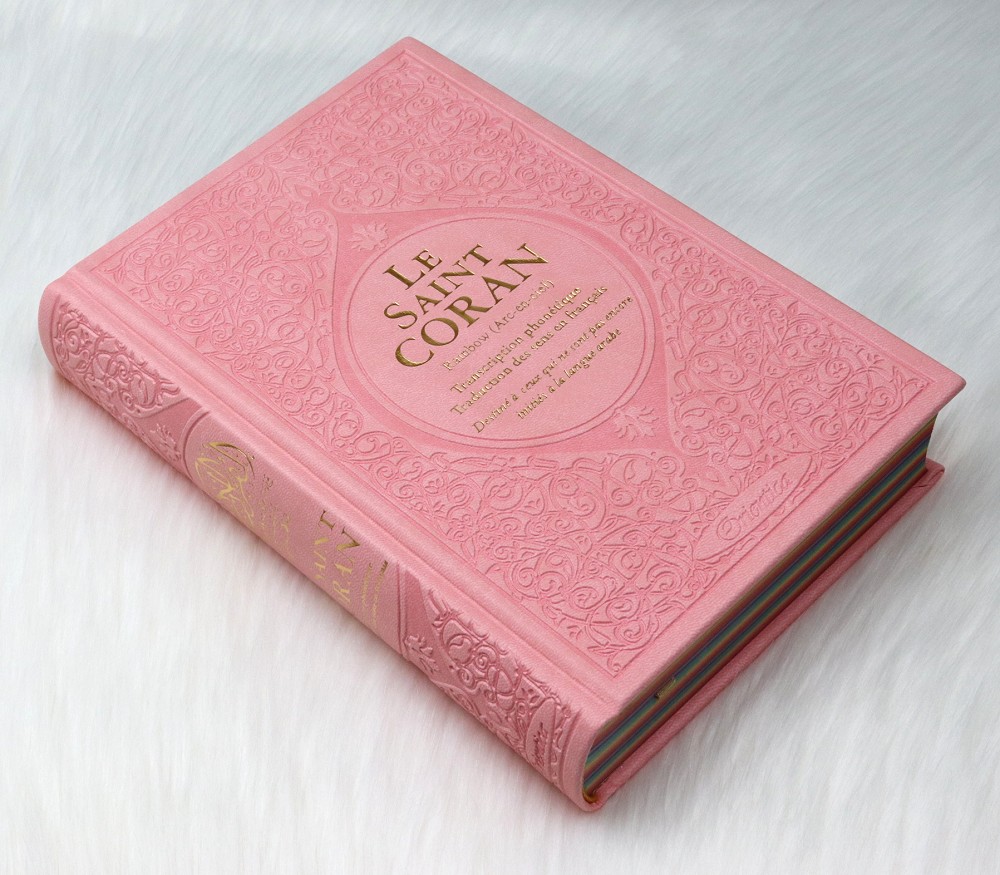 Magnifique Coran avec couverture cartonnée de type cuir (doux au toucher). Très jolie couleur rose clair. Idéal pour offrir.