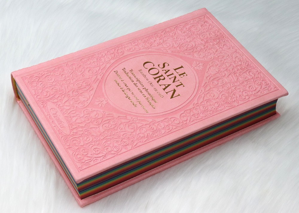 Le Noble Coran avec pages en couleur Arc-en-ciel (Rainbow) - Bilingue (français/arabe) - Couverture Cuir de couleur rose doré - REF. 36135 (25.90 €)