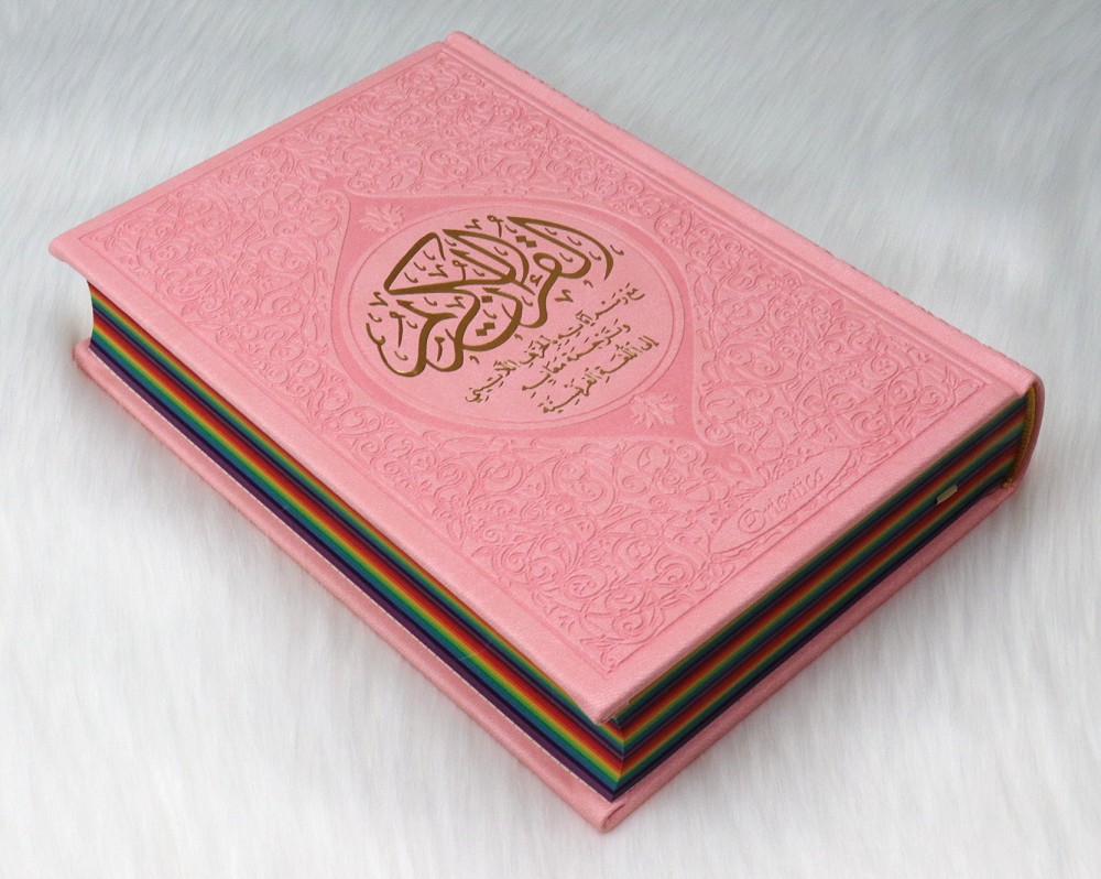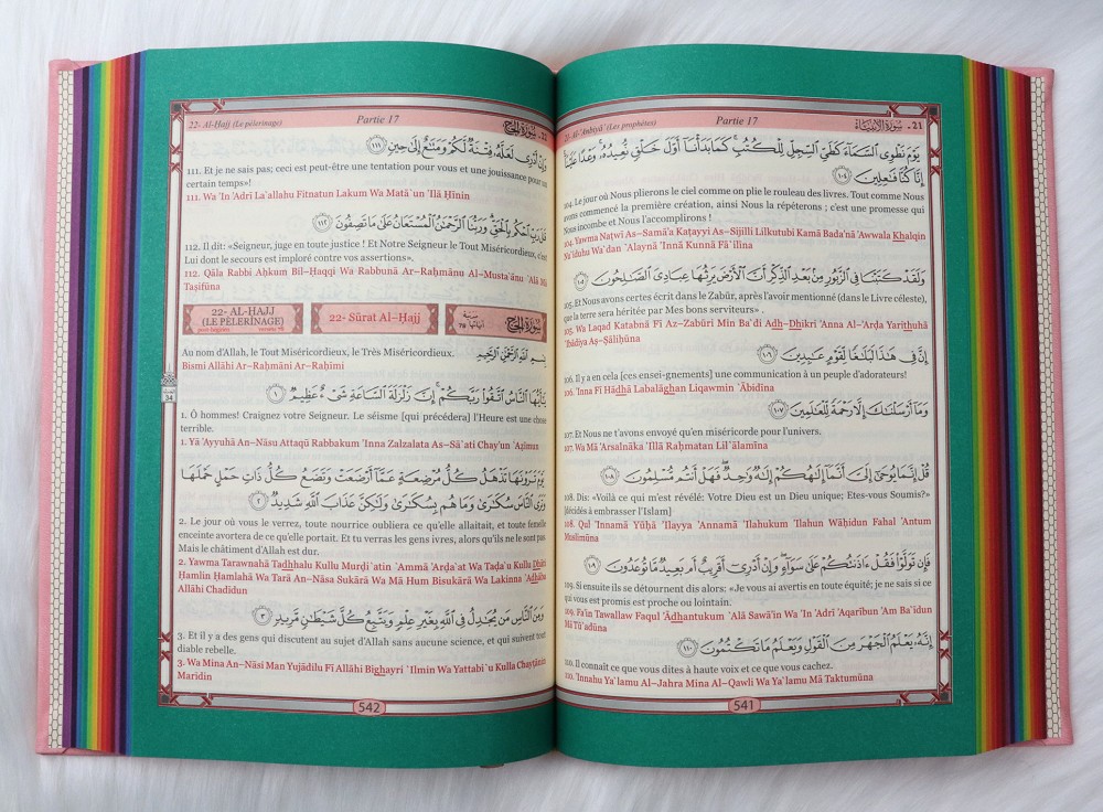 Dans ce magnifique Coran chaque partie (Jouz') est coloré avec une couleur différente, avec un dégradé sous forme d'arc-en-ciel. Ce qui aide l'apprentissage la révision du Coran.