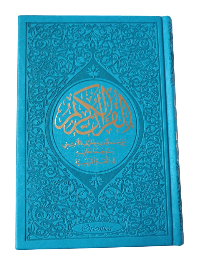 Le Saint Coran en arabe + Transcription phonétique (de l'arabe) et Traduction des sens en français - Edition de luxe - Couverture simili cuir bleu-turquoise dorée - REF. 36189 (26.90 €)