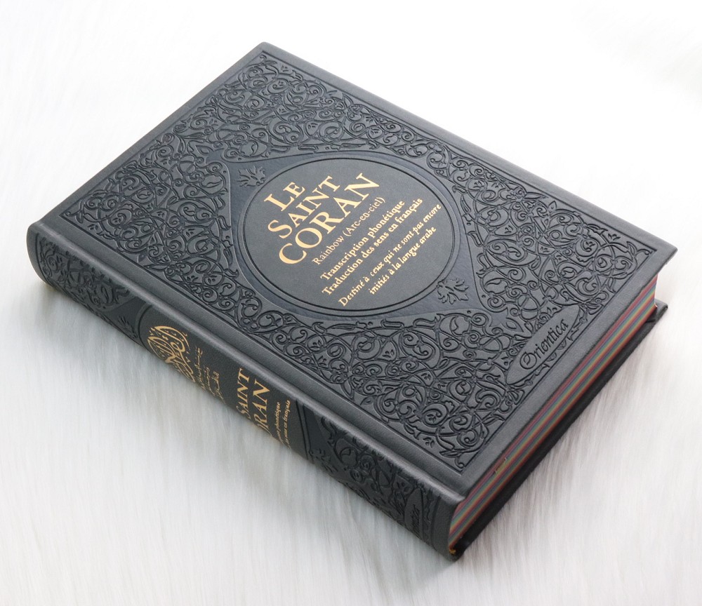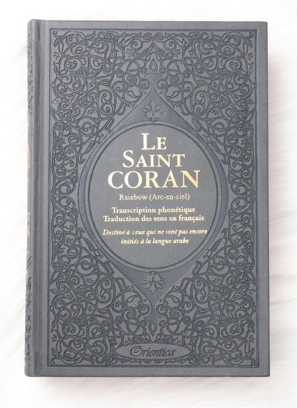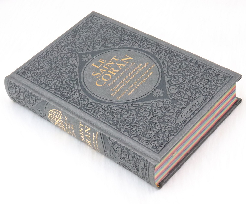 Le Saint Coran Rainbow (Arc-en-ciel) - Français/arabe avec transcription phonétique - Edition de luxe - Couverture Cuir Grise dorée Livre Coup de coeur
