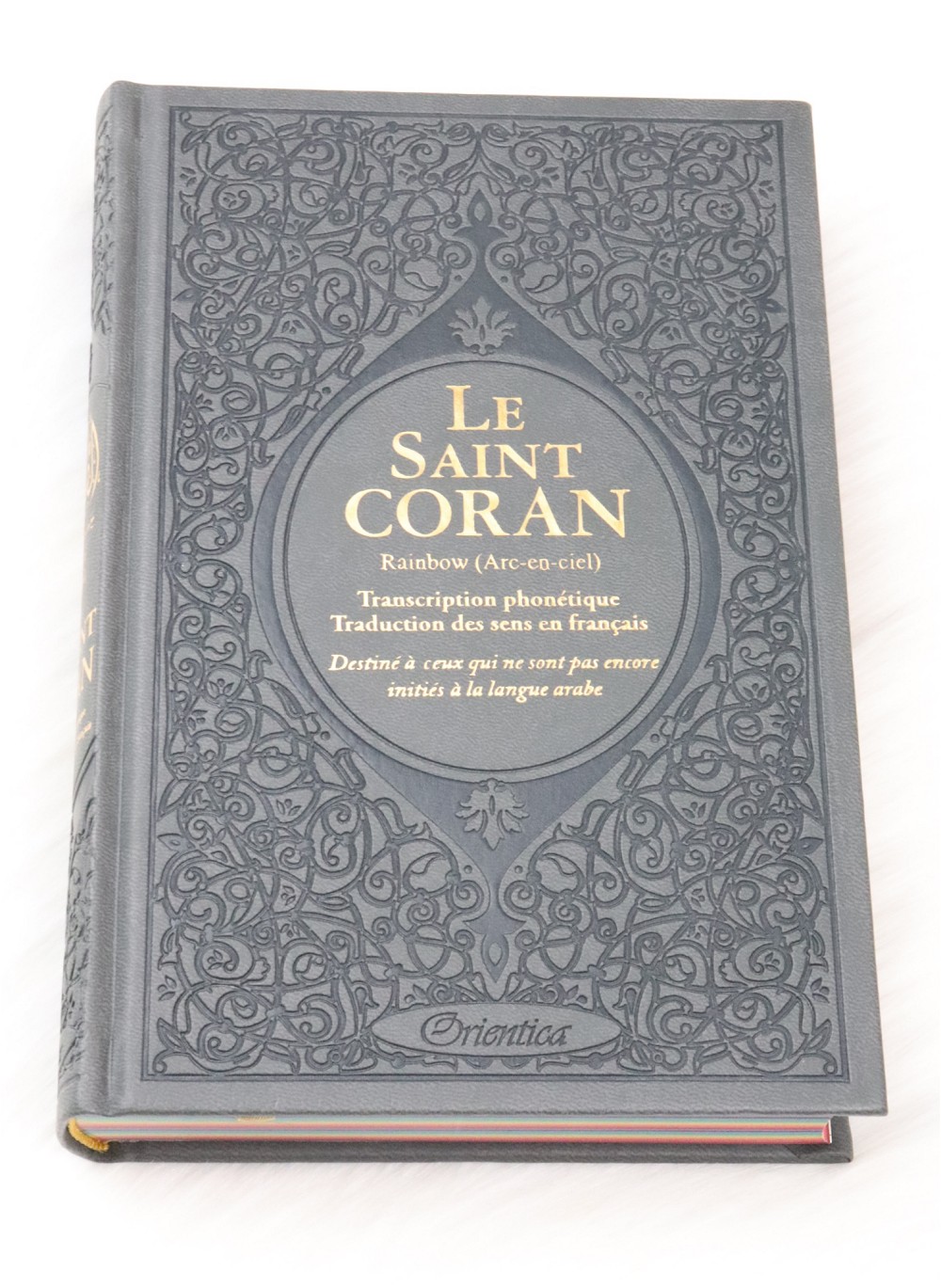 Le Saint Coran Rainbow (Arc-en-ciel) - Francais/arabe avec transcription phonetique - Edition de luxe - Couverture Cuir Grise doree