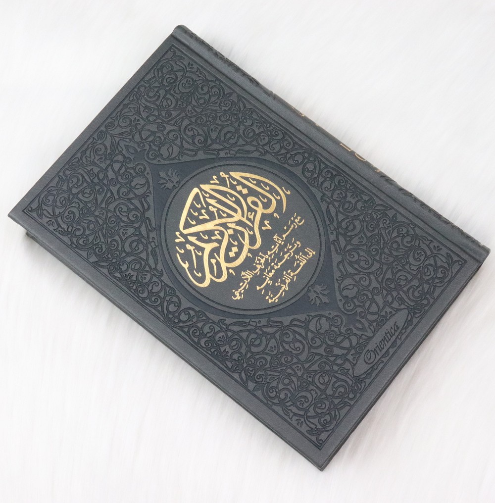 Magnifique Coran avec couverture cartonnée de type cuir (doux au toucher). Très jolie couleur grise. Idéal pour offrir.