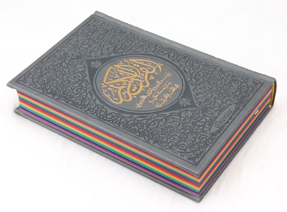Le Noble Coran avec pages en couleur Arc-en-ciel (Rainbow) - Bilingue (français/arabe) - Couverture Cuir de couleur grise dorée - REF. 36143 (25.90 €)