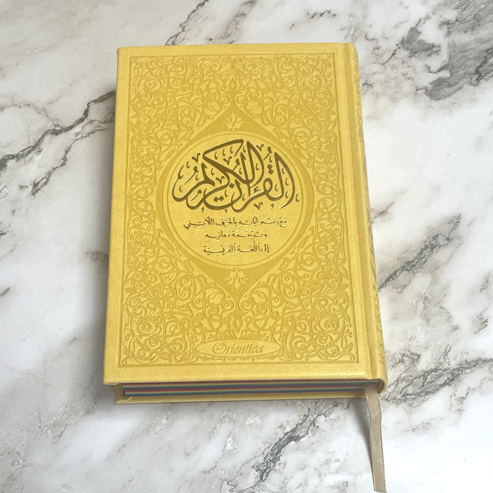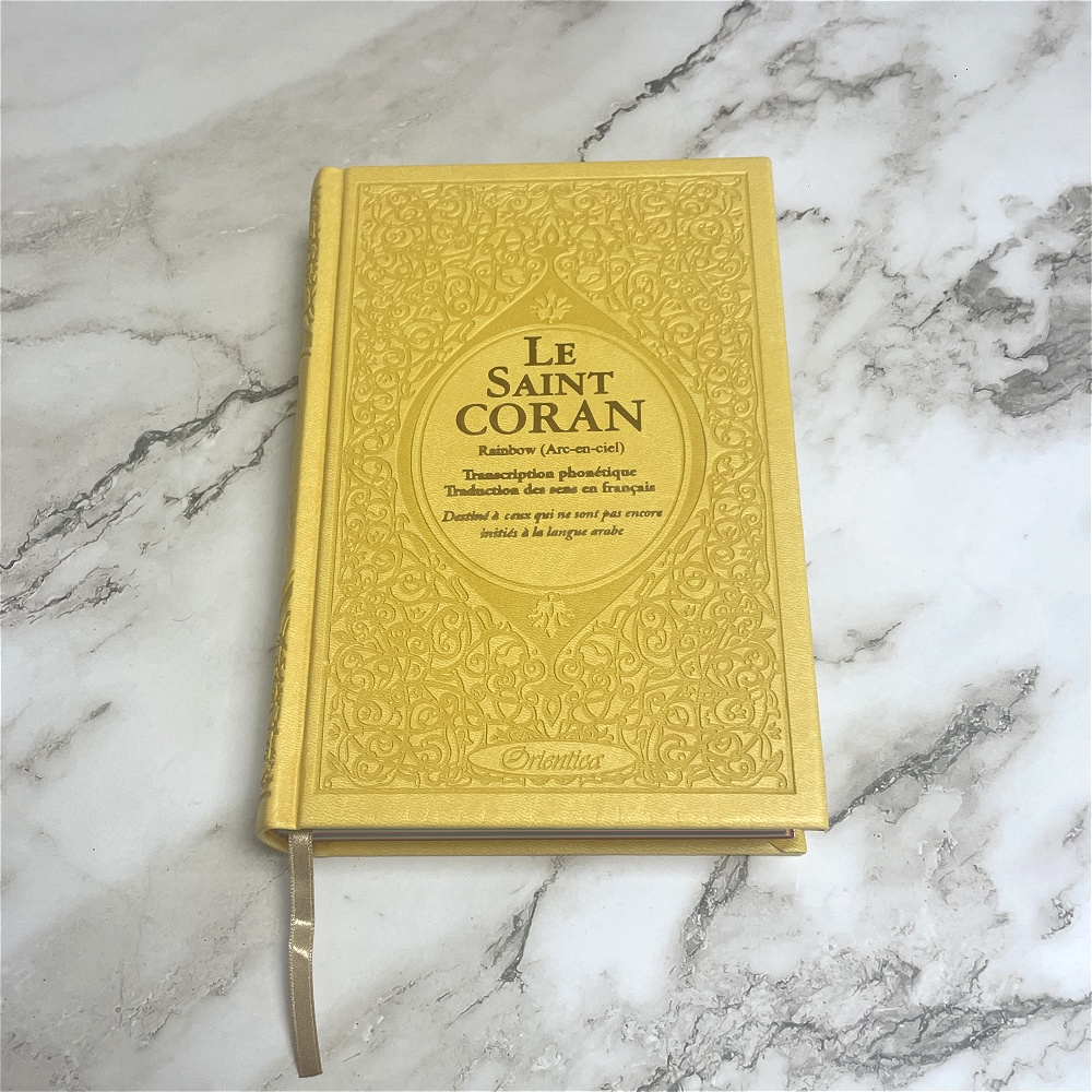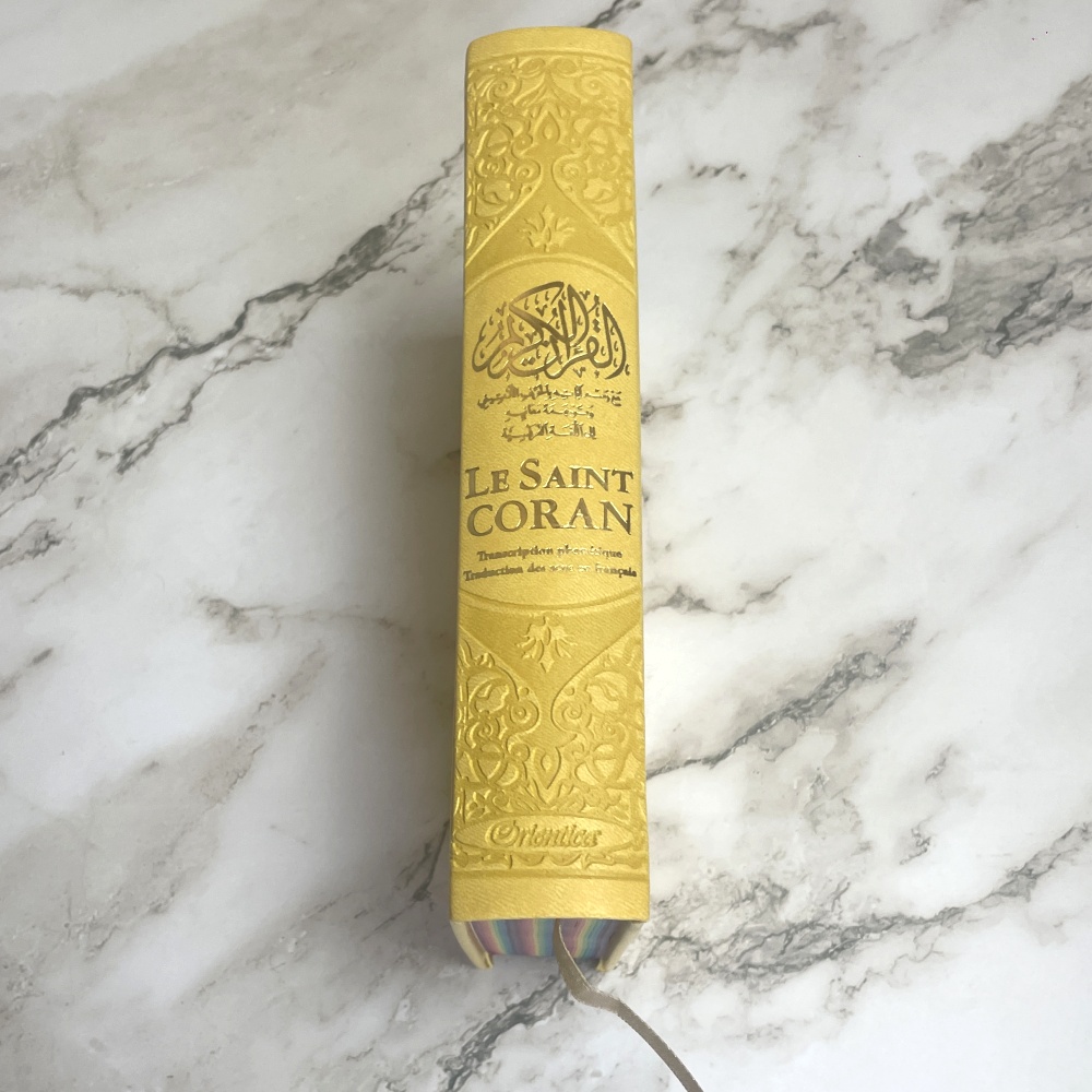 Magnifique Coran avec couverture cartonnée de type cuir (doux au toucher). Très jolie couleur jaune dorée. Idéal pour offrir.