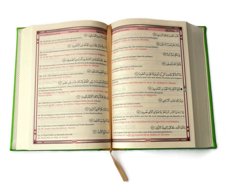 Le saint Coran avec versets en arabe, traduction française + transcription phonétique (translittération de l'arabe en caractères latins). Impression couleur, avec marque page intégré.