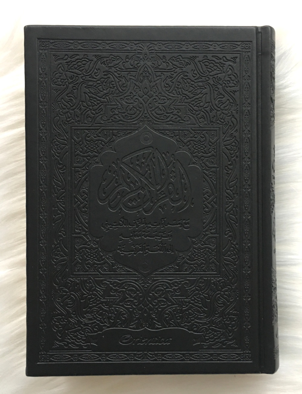 Magnifique Coran avec couverture cartonnée de type cuir/cuir, doux au toucher. Très jolie couleur noir. Idéal pour offrir.