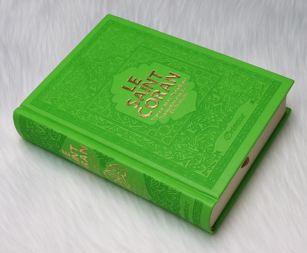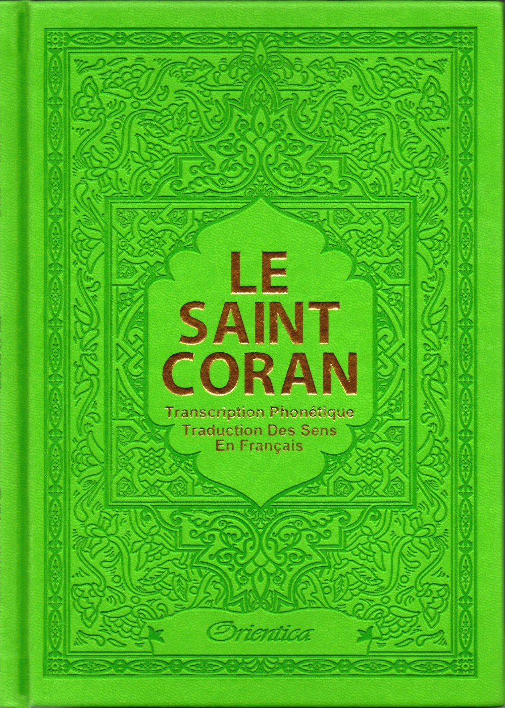 Le saint Coran avec versets en arabe, traduction française + transcription phonétique (translittération de l'arabe en caractères latins). Impression couleur, avec marque page intégré.