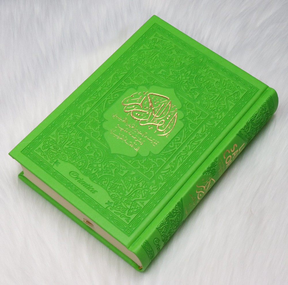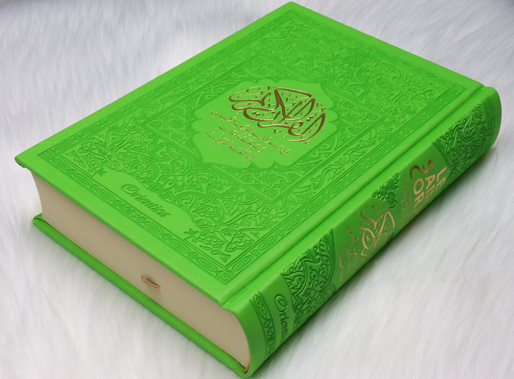 Magnifique Coran avec couverture cartonnée de type cuir/cuir, doux au toucher. Très jolie couleur "vert clair dorée". Idéal pour offrir.