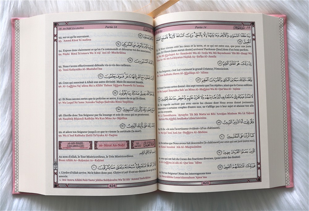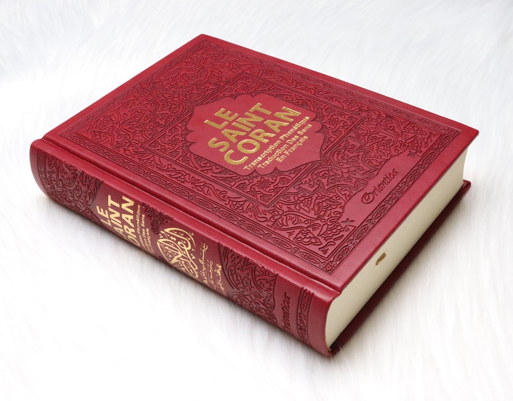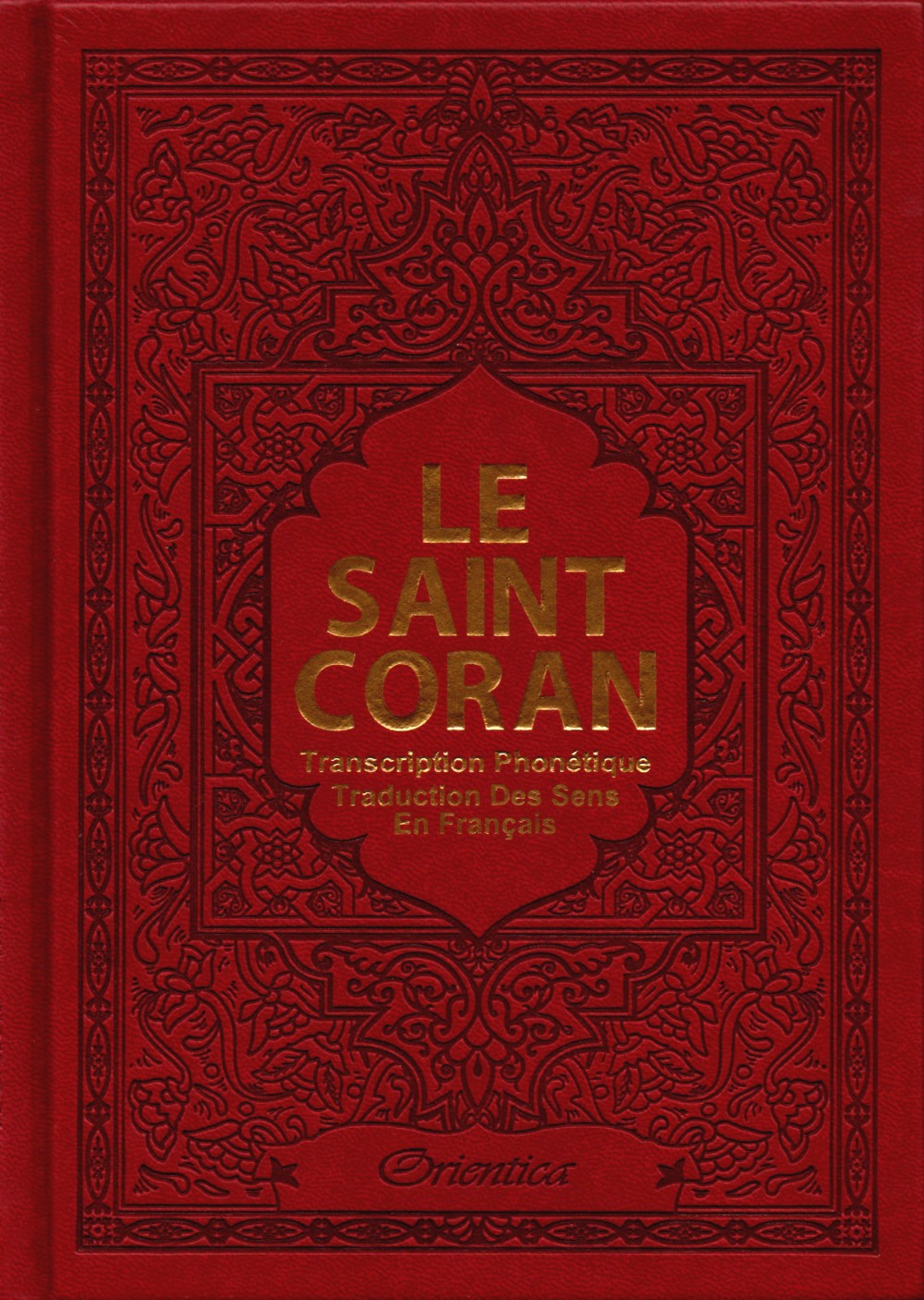 Le saint Coran avec versets en arabe, traduction française + transcription phonétique (translittération de l'arabe en caractères latins). Impression couleur, avec marque page intégré.