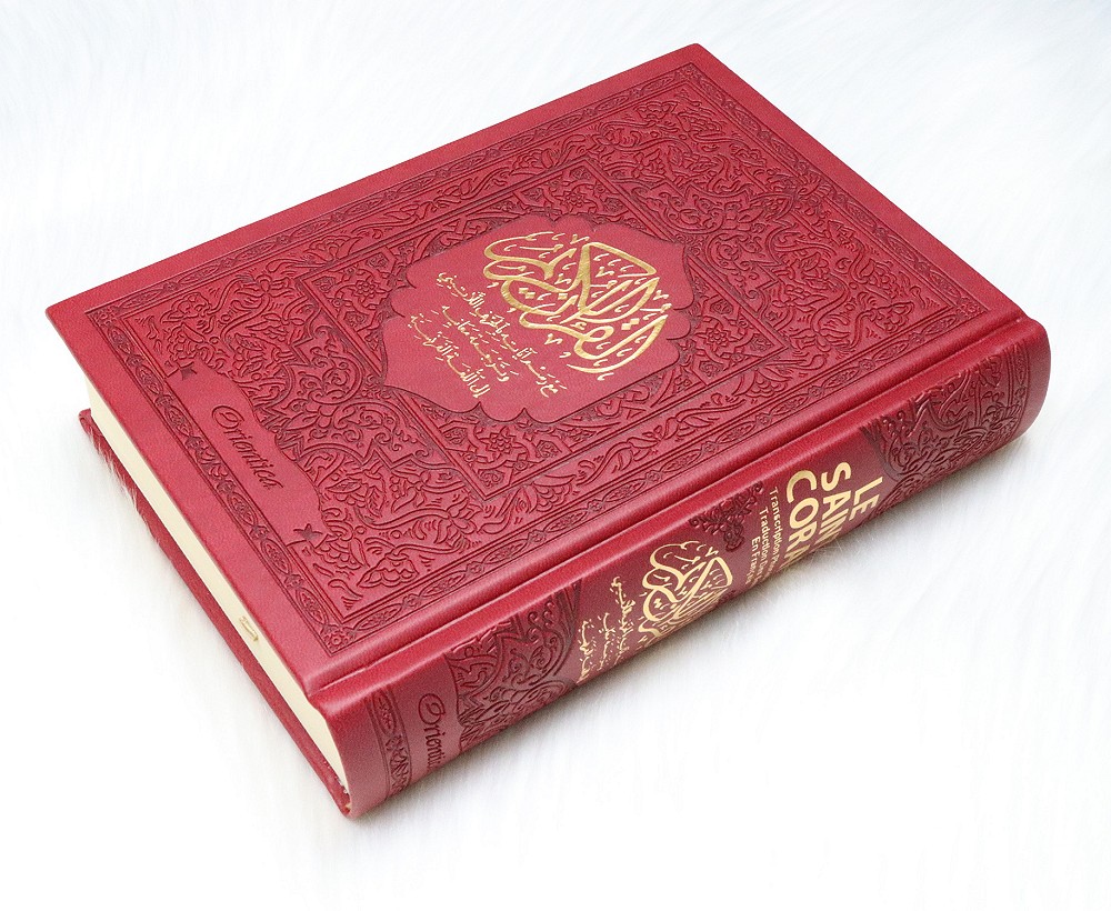 Magnifique Coran avec couverture cartonnée de type cuir/cuir, doux au toucher. Très jolie couleur bordeaux dorée. Idéal pour offrir.