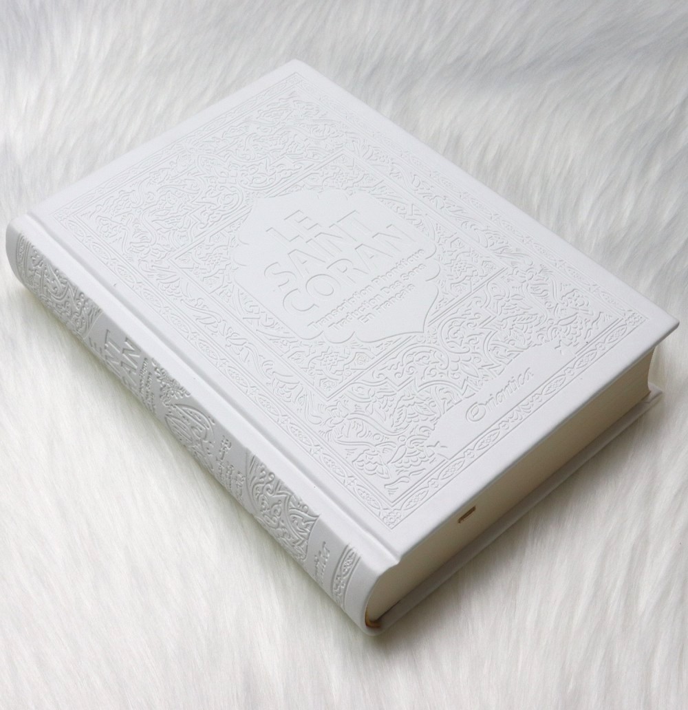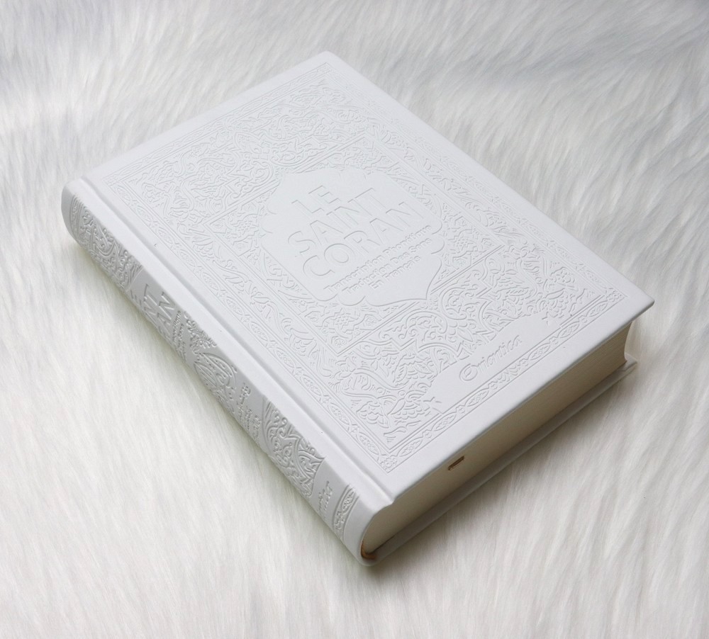 Magnifique Coran avec couverture cartonnée de type cuir/cuir, doux au toucher. Très jolie couleur blanche. Idéal pour offrir.