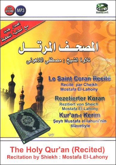 Le Saint Coran complet récité par Cheiykh Mustafâ Al-Lâhouni avec Tafseer Al Jalâlay et la traduction de ses sens en Anglais, Français, Allemand et Turc. En plus quelques passages d'invocation : Azhan, Takbeer El Aid, La Talbya de Hajj ... Fonctionne en mode CD MP3 ou en mode logiciel CD-ROM PC.