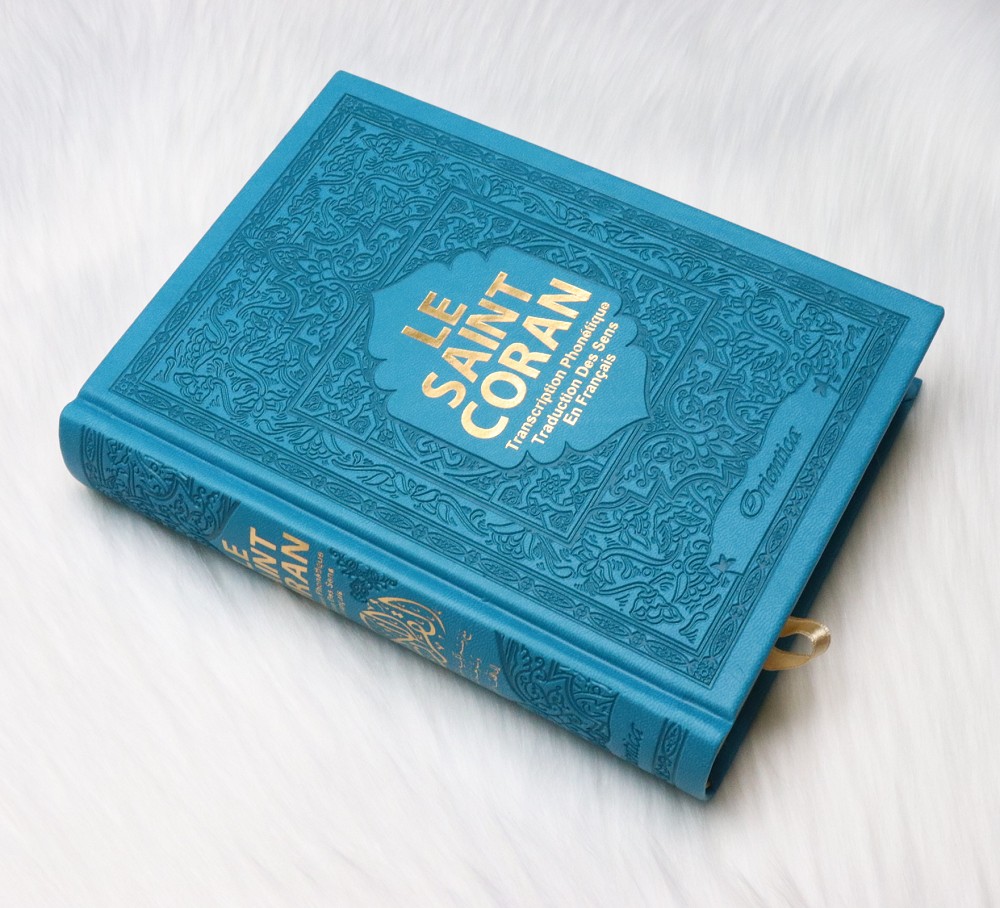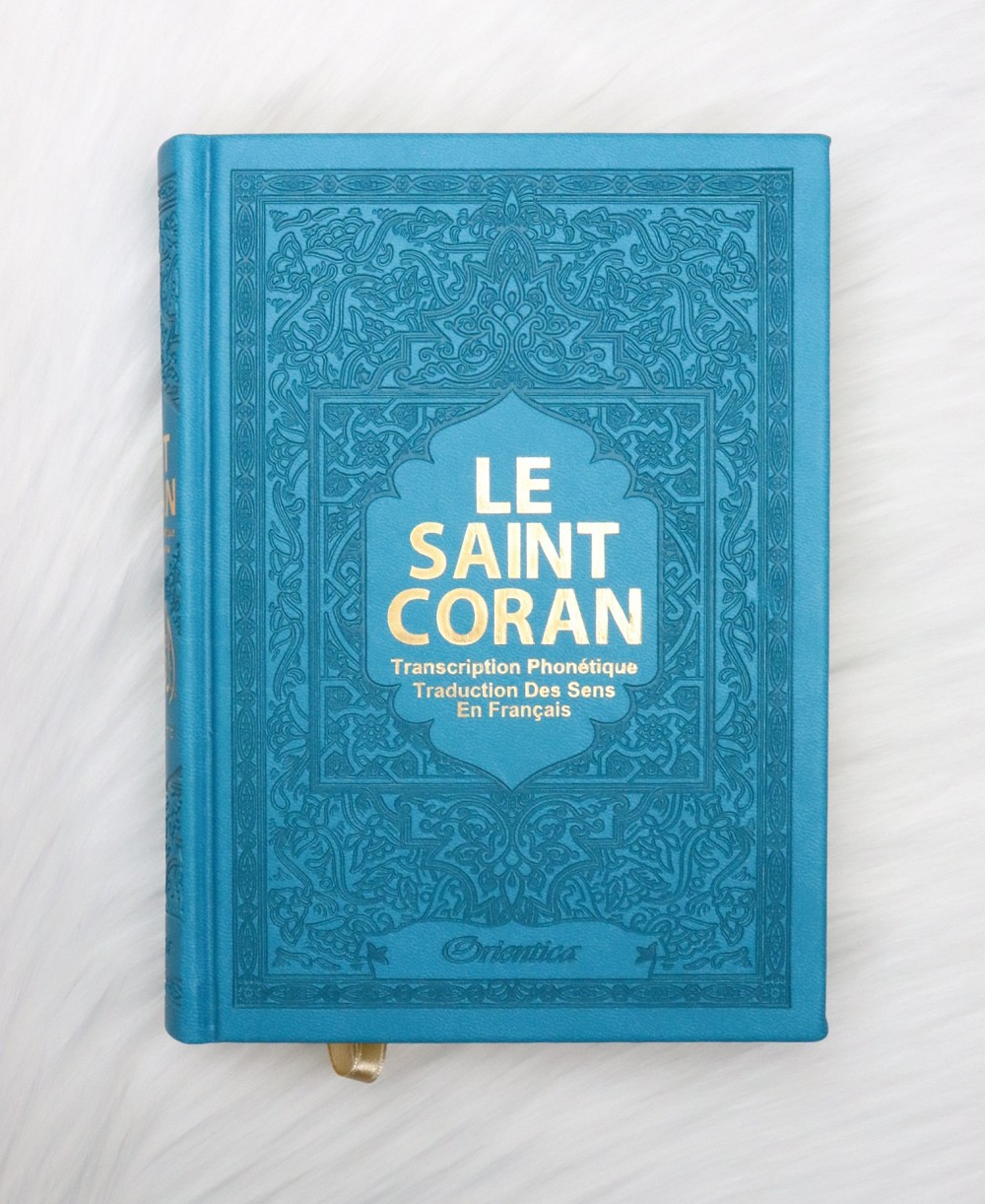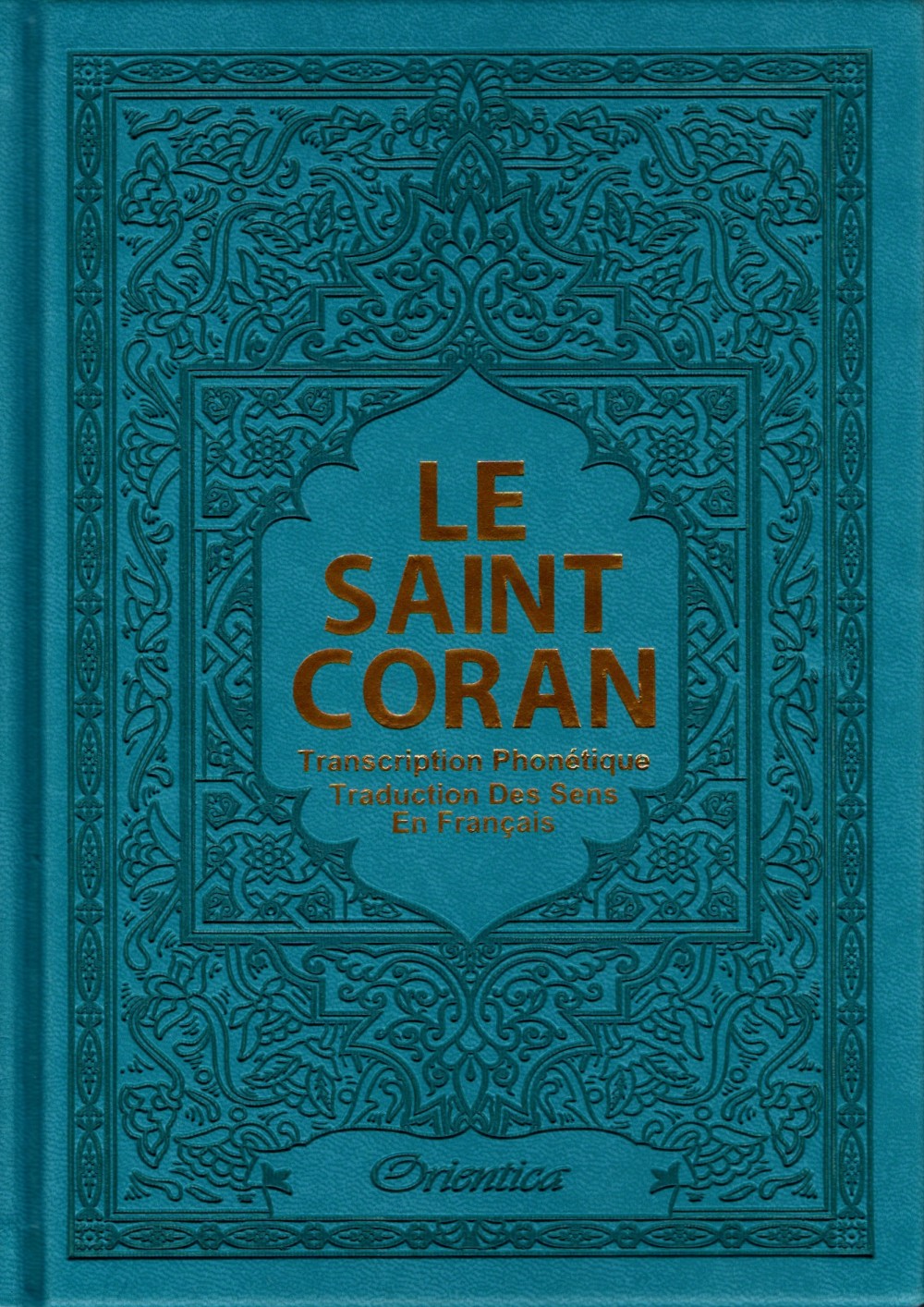 Le Saint Coran - Transcription (phonétique) en caractères latins et Traduction des sens en français - Edition de luxe (Couverture cuir colorée bleu-turquoise avec dorure)