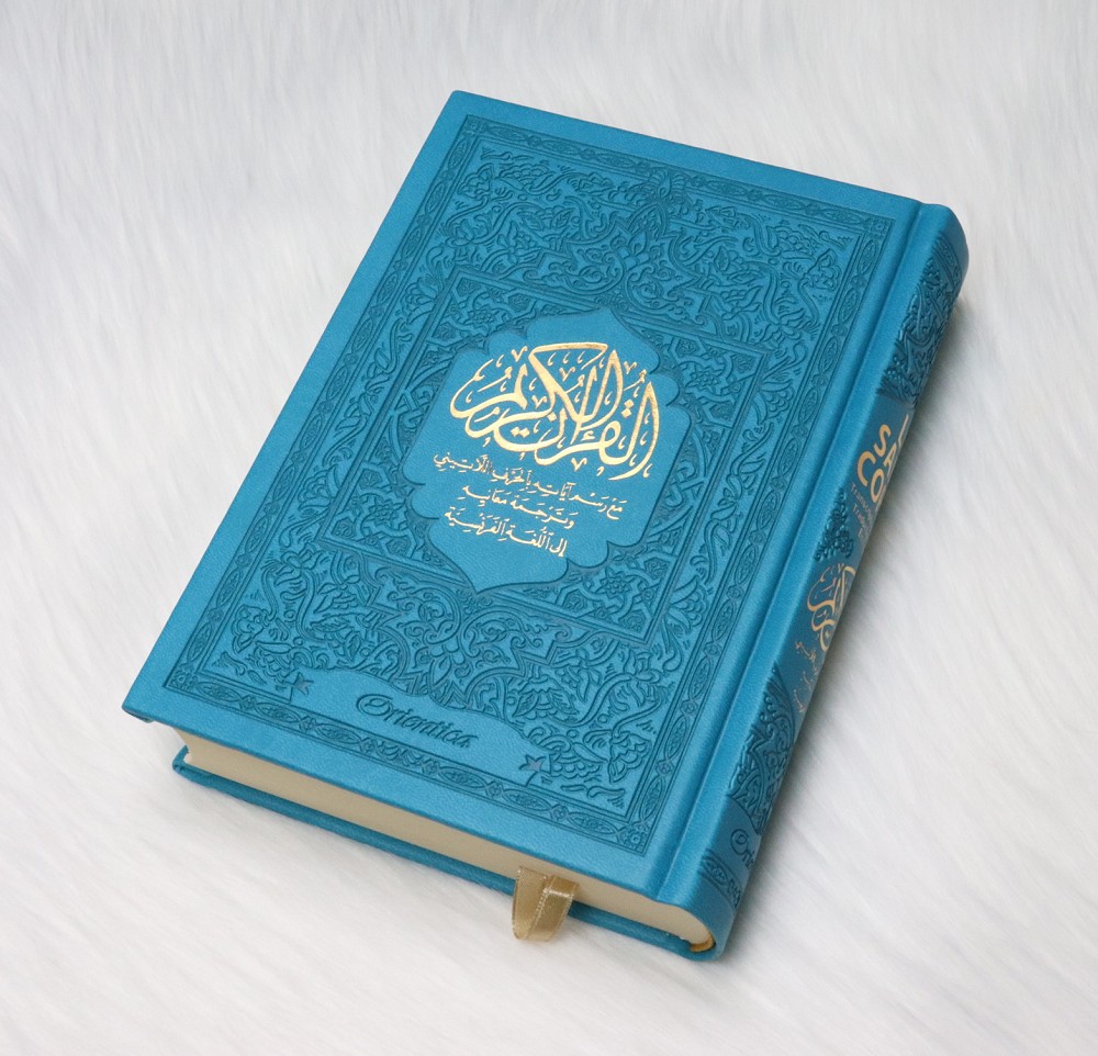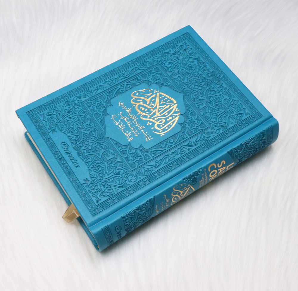 Magnifique Coran avec couverture cartonnée de type cuir (doux au toucher). Très jolie couleur bleu-turquoise dorée. Idéal pour offrir.