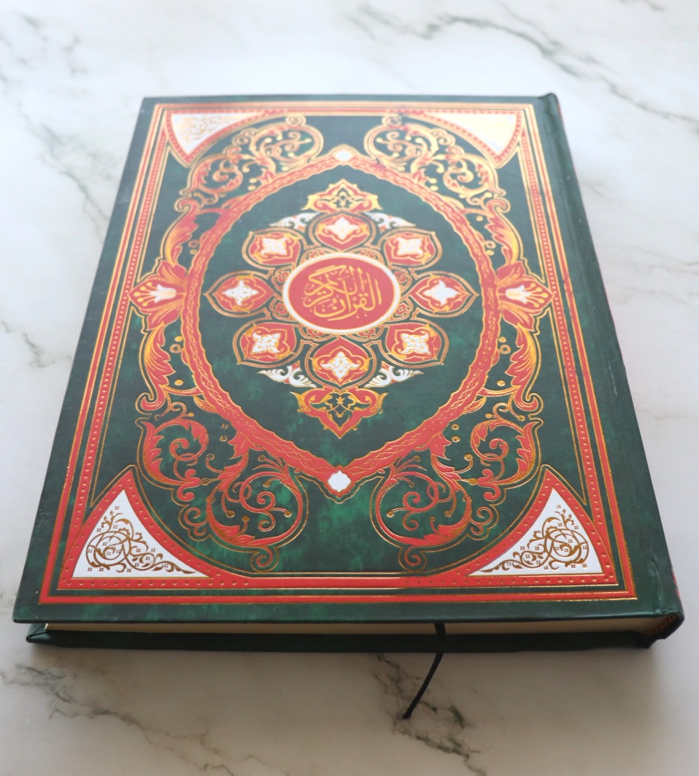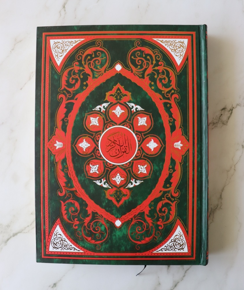 Très Grand Coran (25 x 35 cm) en langue arabe (Lecture Hafs) avec couverture décorée en rouge et dorures.