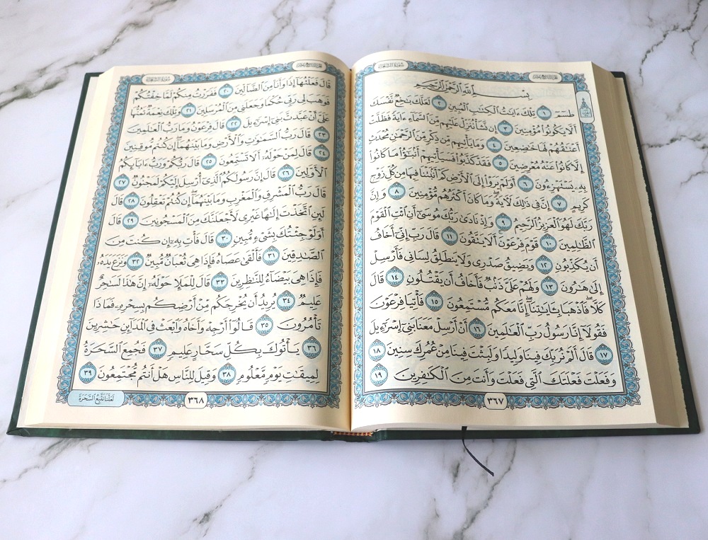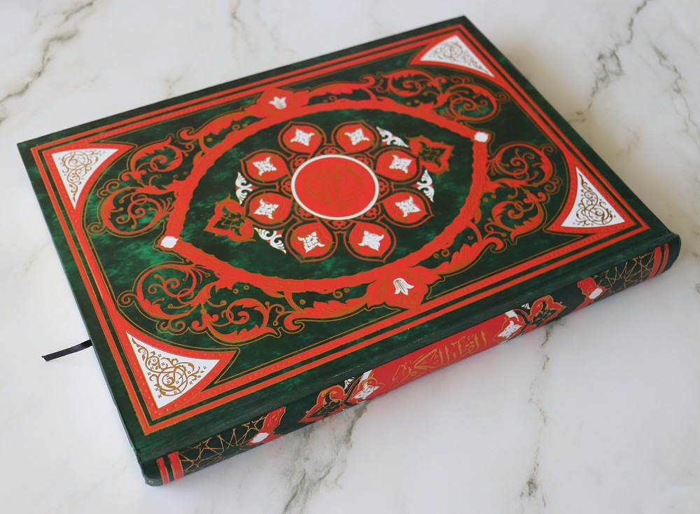 Impression en deux couleurs sur du papier de qualité couleur crème. Marque page intégré. Très grande taille du texte arabe.