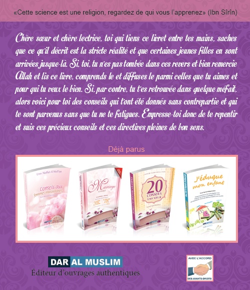 Chère soeur et chère lectrice, toi qui tiens ce livret entre tes mains, saches que ce qu'il décrit est la stricte réalité que certaines jeunes filles en sont arrivées jusque-là. Si, toi aussi tu n'as pas eu ces revers remercie Allah et lis ce livre, comprends-le et diffuse le parmi celles que tu aimes et pour qui tu veux le bien. Si, par contre, tu t'es retrouvé dans des difficultés, alors voici pour toi des conseils qui t'ont été donnés sans contrepartie et qui te sont parvenus sans que que tu ne te fatigues. Empresse-toi donc de te repentir et suis ces précieux conseils et ces directives pleines de bon sens.