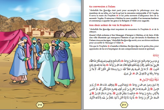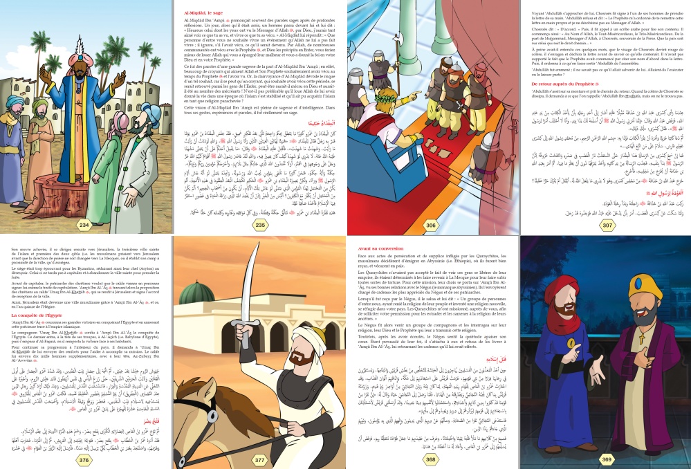 Ce livre captivant, au texte bilingue (arabe-français), simple et pédagogique, adapté aussi bien au jeune public qu’aux adultes, retrace les moments clés de la vie de ces illustres personnages. Il relate également comment ces proches disciples du Prophète ﷺ ont puisé dans la lumière de sa Sunna et l’ont soutenu dans sa mission.