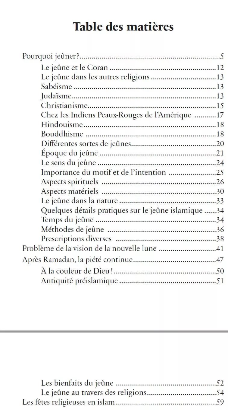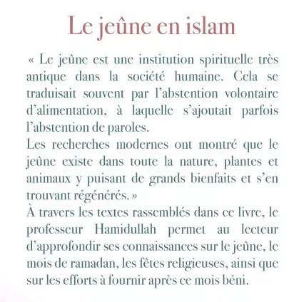 Le jeûne est une institution spirituelle très antique dans la société humaine. Cela se traduisait souvent par l’abstention volontaire d’alimentation, à laquelle s’ajoutait parfois l’abstention de paroles. Les recherches modernes ont montré que le jeûne existe dans toute la nature, plantes et animaux y puisant de grands bienfaits et s’en trouvant régénérés. » À travers les textes rassemblés dans ce livre, le professeur Hamidullah permet au lecteur d’approfondir ses connaissances sur le jeûne, le mois de ramadan, les fêtes religieuses, ainsi que sur les efforts à fournir après ce mois béni.