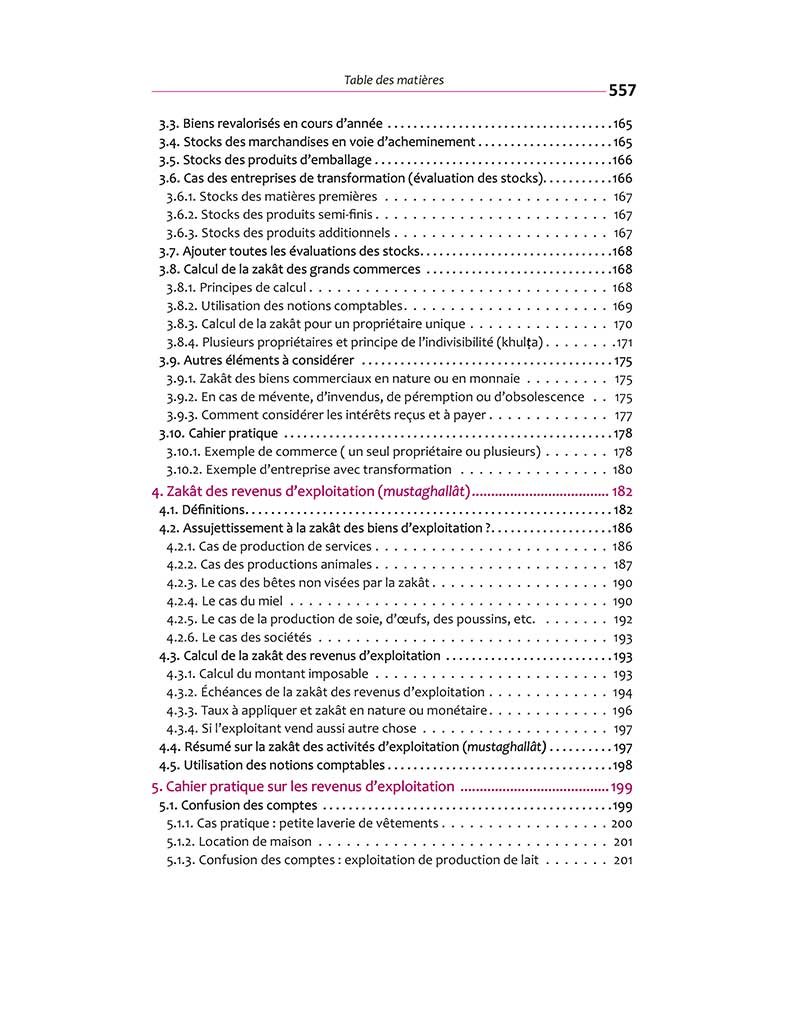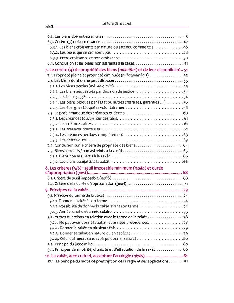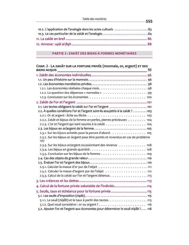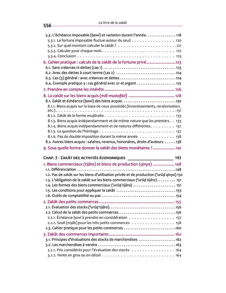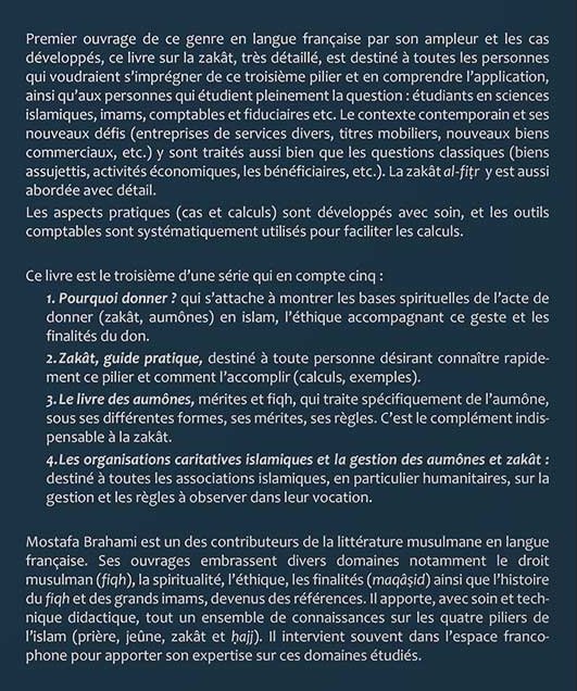 Premier ouvrage de ce genre en langue française par son ampleur et les cas développés, ce livre sur la zakât, très détaillé, est destiné à toutes les personnes qui voudraient s’imprégner de ce troisième pilier et en comprendre l’application, ainsi qu’aux personnes qui étudient pleinement la question: étudiants en sciences islamiques, imams, comptables et fiduciaires etc. Le contexte contemporain et ses nouveaux défis (entreprises de services divers, titres mobiliers, nouveaux biens commerciaux, etc.) y sont traités aussi bien que les questions classiques (bien assujettis, activités économiques, les bénéficiaires, etc.). La zakât al-fitr y est aussi abordée avec détail. Les aspects pratiques (cas et calculs) sont développés avec soin, et les outils comptables sont systématiquement utilisés pour faciliter les calculs.