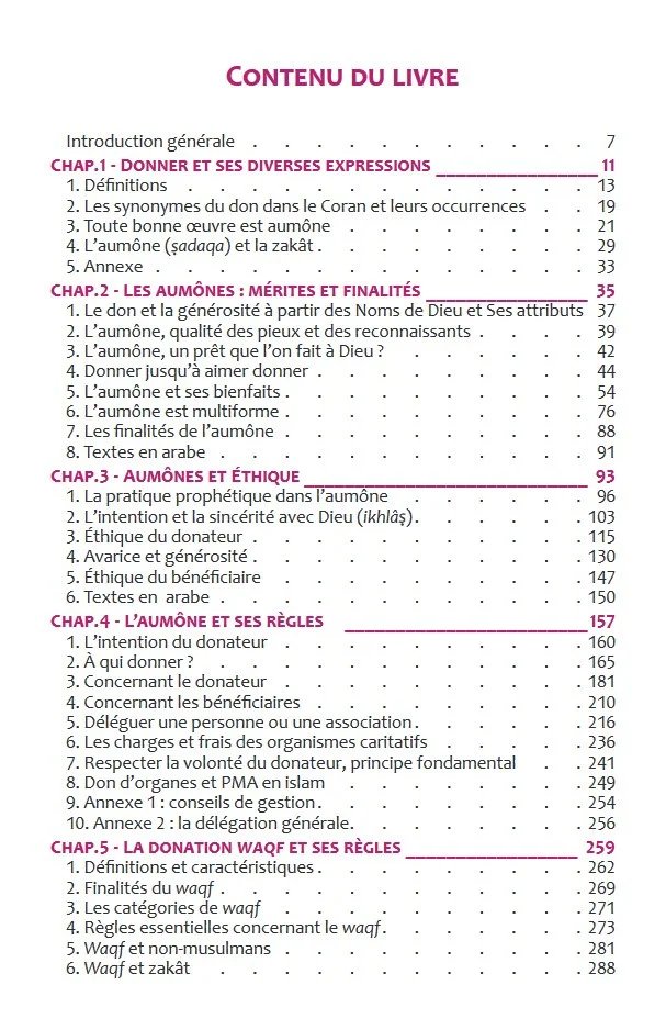 Ce livre traite des aumônes, d'un point de vue spirituel avec leurs mérites, et d'un point de vue pratique avec les règles qui les valident, les orientent. En effet, toute oeuvre réalisée par le musulman doit être sous-tendue par une intention pure (de l'avoir faite pour Dieu) et être conforme aux enseignements divins et prophétiques, d'où la nécessité de connaître les aspects de fiqh. Les diverses formes des aumônes sont étudiées : aumônes recommandées libres, celles durables (sadaqa jâriya), le waqf, celles des diverses expiations (kaffârât), et les legs testamentaires (wasiyya). Toute bonne œuvre, comme les aumônes, doit être accompagnée par une éthique afin de la rendre plus belle. C'est pourquoi nous traitons de la pratique prophétique dans le don, de l'éthique du donateur et du bénéficiaire.