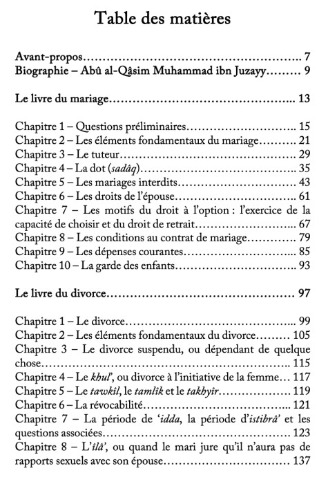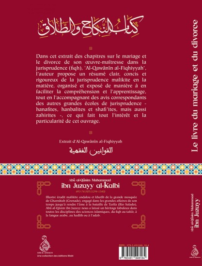 Dans cet extrait des chapitres sur le mariage et le divorce de son œuvre-maîtresse dans le fiqh, ‘Al-Qawânîn al-Fiqhiyyah’, l’auteur propose un résumé clair, concis et rigoureux de la jurisprudence malikite en la matière, organisé et exposé de manière à en faciliter la compréhension et l’apprentissage, tout en l’accompagnant des avis correspondants des autres grandes écoles de jurisprudence – hanafites, hanbalites et shafi’ites, mais aussi zahirites -, ce qui fait tout l’intérêt et la particularité de cet ouvrage.