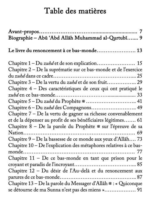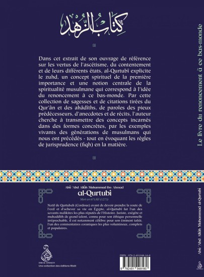 Dans cet extrait de son ouvrage de référence sur les vertus de l’ascétisme, du contentement et de leurs différents états, al-Qurtubî explicite le zuhd, un concept spirituel de la première importance et une notion centrale de la spiritualité musulmane qui correspond à l’idée du renoncement à ce bas-monde. Par cette collection de sagesses et de citations tirées du Qur’ân et des ahâdîths, de paroles des pieux prédécesseurs, d’anecdotes et de récits, l’auteur cherche à transmettre des concepts incarnés dans des formes concrètes, par les exemples vivants des générations de musulmans qui nous ont précédés – tout en évoquant les règles de jurisprudence (fiqh) en la matière.