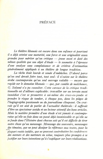 En Egypte, Tawfiq Al Hakim a été, vers les années 20, le premier à vouloir introduire le théâtre en tant que genre d’expression et de création dans la culture arabe. Au Liban, il a fallu attendre les années 60 pour voir naître une production dramatique en langue arabe. Le théâtre est entré dans le monde arabe à la faveur des contacts avec l’Occident. C’est ce qui explique que c’est avant tout un théâtre d’adaptation, voire de simple traduction. Ghassane Salamé a choisi d’étudier les dramatiques créées après la défaite de 1967.
