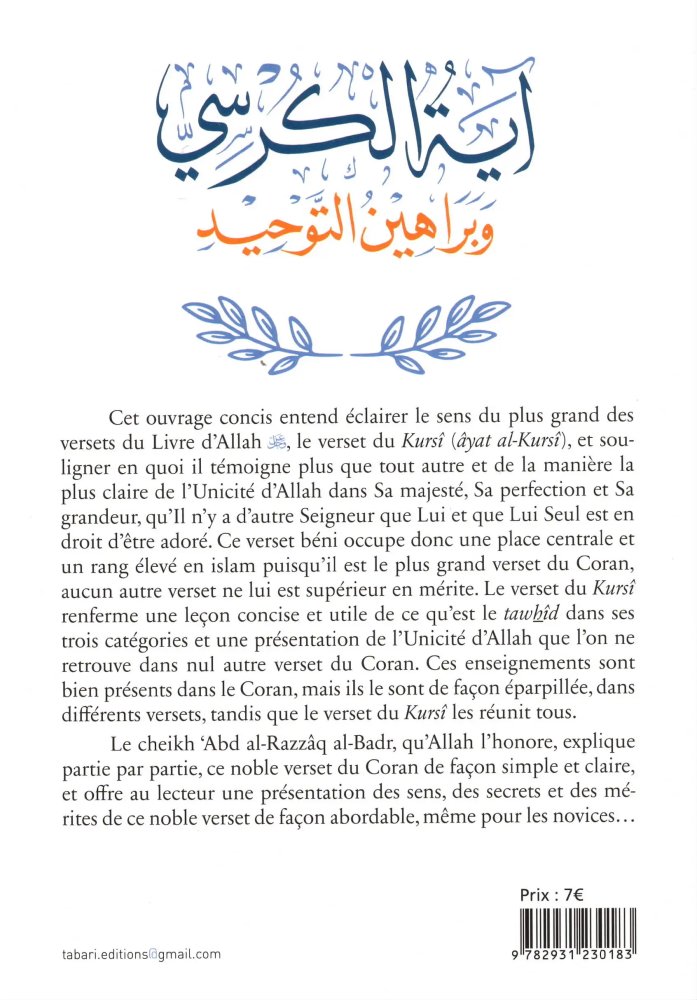 Cet ouvrage concis entend éclairer le sens du plus grand des versets du Livre d'Allah, le verset du Kursi (âyat al-Kursi), et souligner en quoi il témoigne plus que tout autre et de la manière la plus claire de l'Unicité d'Allah dans Sa majesté, Sa perfection et Sa grandeur, qu'Il n'y a d'autre Seigneur que Lui et que Lui Seul est en droit d'être adoré. Ce verset béni occupe donc une place centrale et un rang élevé en islam puisqu'il est le plus grand verset du Coran, aucun autre verset ne lui est supérieur en mérite. Le verset du Kursî renferme une leçon concise et utile de ce qu'est le tawhid dans ses trois catégories et une présentation de l'Unicité d'Allah que l'on ne retrouve dans nul autre verset du Coran.