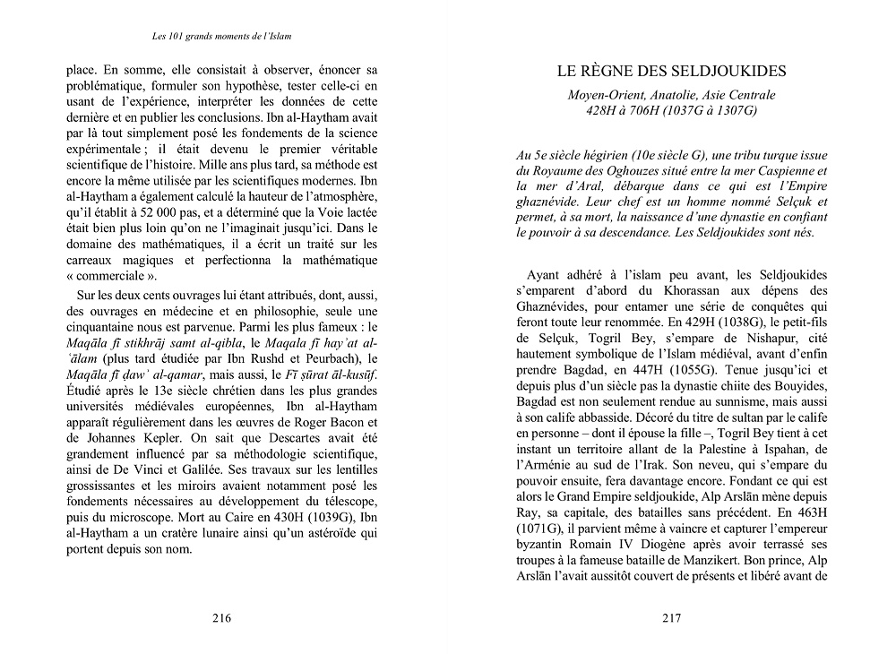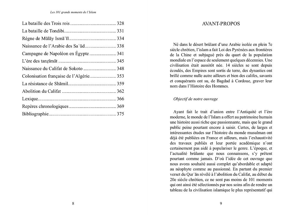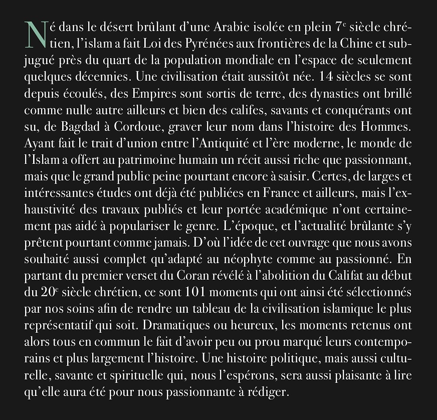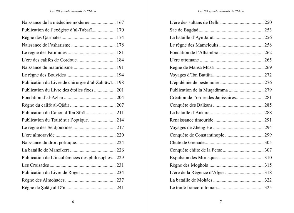 Découvrez au travers de ses pages quelques-uns des grands moments et événements ayant fait l’histoire de la civilisation islamique, ceci de l’ère de la Révélation coranique à nos jours. De la bataille de Badr à l’abolition du Califat, du voyage d’Ibn Baṭṭūṭa à la chute de Grenade en passant par la naissance du malikisme ou la conquête de Constantinople par les Ottomans, plongez-vous dans 14 siècles d’un monde à la jonction des époques et des continents.