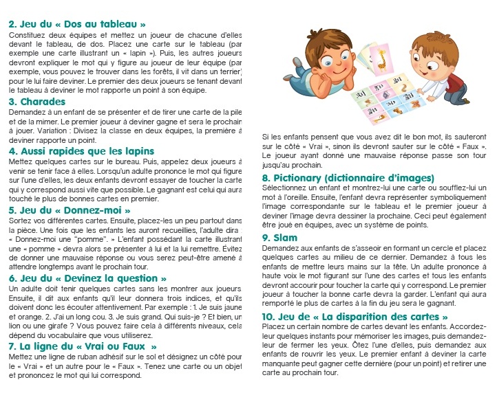 La boite contient 50 grandes cartes cartonnées de format 17 x 11 cm et un mode d'emploi en langue française détaillant les 10 façons de jouer.