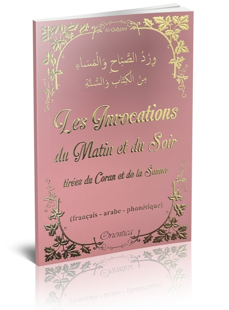 Les Invocations du Matin et du Soir selon le Coran et la Sunna (Wirdu-s-sabâh wa-l-masâ’ minal kitâbi wassunnah) en français - arabe - phonétique. Livre de poche de couleur rose dorée.