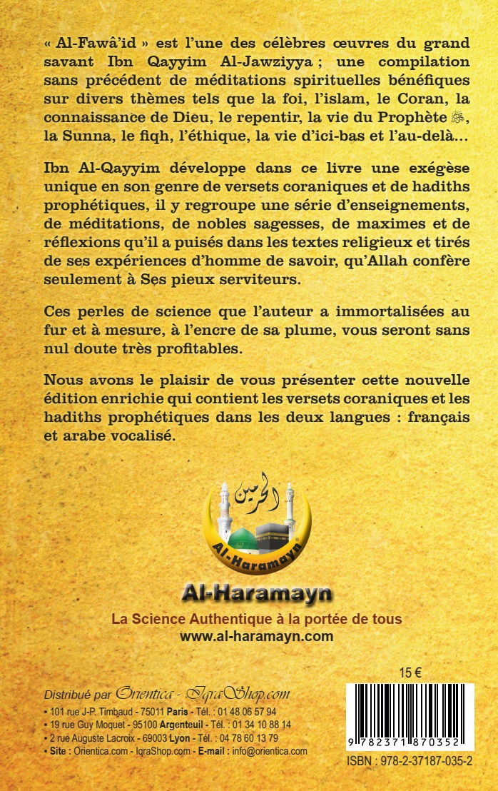 « Al-Fawâ’id » est l’une des célèbres œuvres du grand savant Ibn Qayyim Al-Jawziyya ; une compilation sans précédent de méditations spirituelles bénéfiques sur divers thèmes tels que la foi, l’islam, le Coran, la connaissance de Dieu, le repentir, la vie du Prophète (saw), la Sunna, le fiqh, l’éthique, la vie d’ici-bas et l’au-delà...