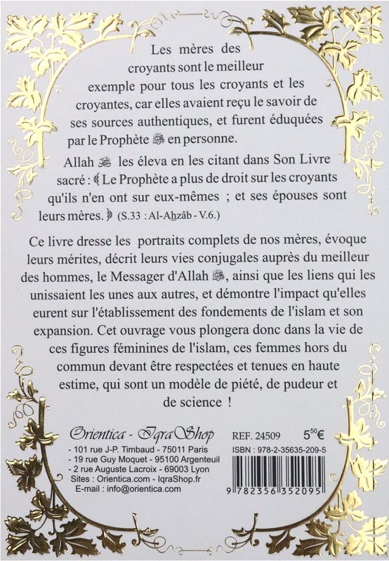 Ce livre dresse les portraits complets de nos mères, évoque leurs mérites, décrit leurs vies conjugales auprès du meilleur des hommes, le Messager d'Allah ﷺ, ainsi que les liens qui les unissaient les unes aux autres, et démontre l'impact qu'elles eurent sur l'établissement des fondements de l'islam et son expansion. Cet ouvrage vous plongera donc dans la vie de ces figures féminines de l'islam, ces femmes hors du commun devant être respectées et tenues en haute estime, qui sont un modèle de piété, de pudeur et de science !