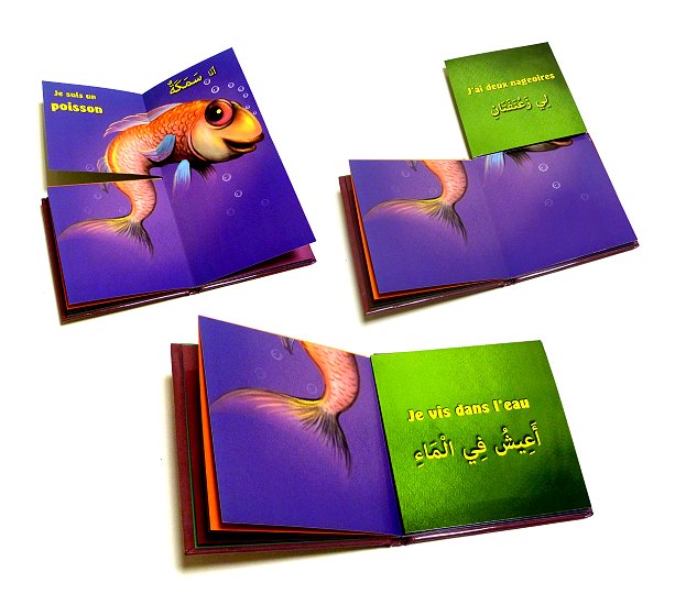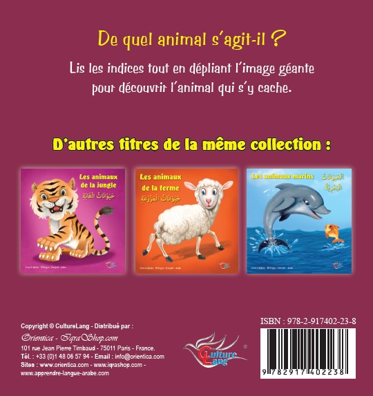 Un livre d'éveil pour les enfants à partir de 2 ans pour découvrir les noms des animaux en français et en arabe.