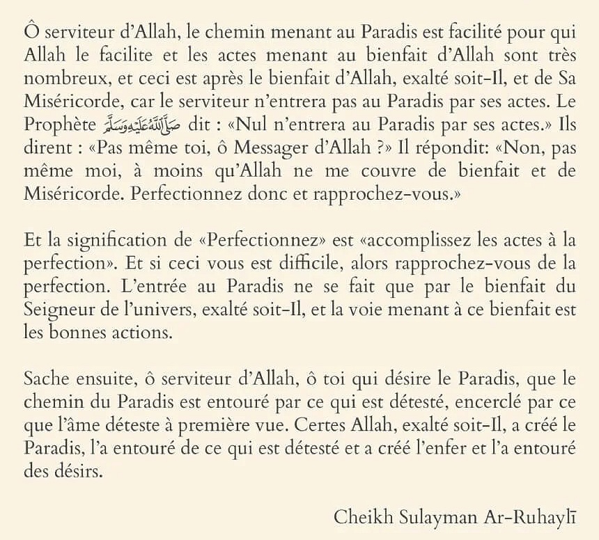 Sache ensuite, ô serviteur d’Allah, ô toi qui désire le Paradis, que le chemin du Paradis est entouré par ce qui est détesté, encerclé par ce que l’âme déteste à première vue. Certes Allah, exalté soit-Il, a créé le Paradis, l’a entouré de ce qui est détesté et a créé l’enfer et l’a entouré des désirs.