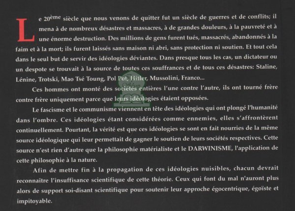 Lee fascisme et le communisme viennent en tête des idéologies qui ont plongés l’humanité dans l’ombre. Ces idéologies étant considérées comme ennemies, elles s’affrontèrent continuellement. Pourtant, la vérité est que ces idéologies se sont en fait nourries de la même source idéologique qui leur permettait de gagner le soutien de leurs sociétés respectives. Cette source n’est rien d’autre que la philosophie matérialiste et le DARWINISME, l’application de cette philosophie à la nature.