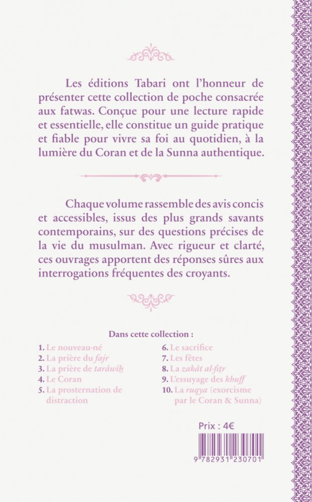 Les Éditions Tabari proposent ici un texte concis, authentique et facile à lire. Les savants y rappellent la miséricorde d’Allah envers les femmes et l’équilibre entre obligation religieuse et bienveillance divine. Cet ouvrage est un compagnon idéal pour les femmes souhaitant approfondir leur compréhension du jeûne (ṣiyâm) dans la jurisprudence islamique.