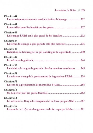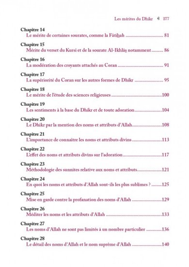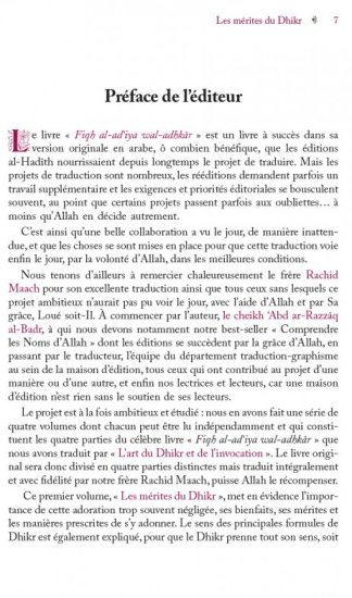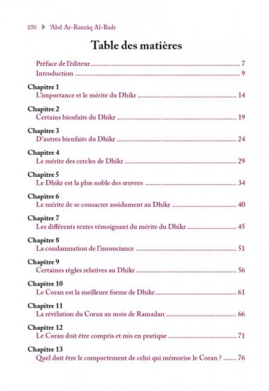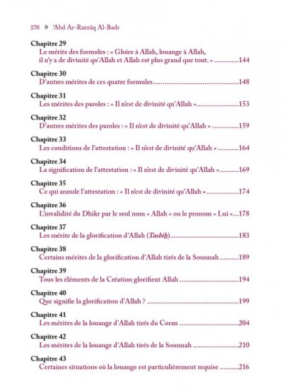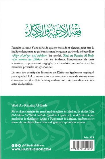 Premier volume d’une série de quatre titres, dont chacun peut être lu indépendamment,le tout constitue les parties du célèbre livre « Fiqh al-ad‘iya wal-adhkâr » du cheikh ‘Abd Ar-Razzâq Al-Badr, « Les mérites du Dhikr ».