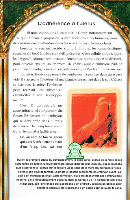 Le style incomparable du Coran et la sagesse supérieure qu'il renferme sont des preuves irréfutables qu'il s'agit de la parole de Dieu. Mais le Coran possède aussi de nombreux attributs miraculeux prouvant qu'il est une révélation divine: un certain nombre de vérités scientifiques, que seule la technologie du 20ème siècle nous a permis de découvrir, étaient déjà affirmées dans le Coran voici 1400 ans.