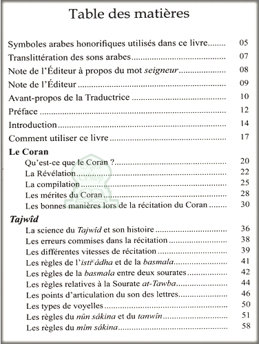 Pour préparer les bases de l'apprentissage correct de la récitation coranique, ou Tajwîd, l'histoire du Coran est brièvement développée de sa révélation à sa compilation. En outre, l'histoire de la science du Tajwîd est évoquée afin d'introduire ses règles. Elles sont détaillées d'une façon simple mais néanmoins claire. Chaque règle est accompagnée d'exemples de verset du Coran pour que les étudiants puissent s'exercer à la récitation.