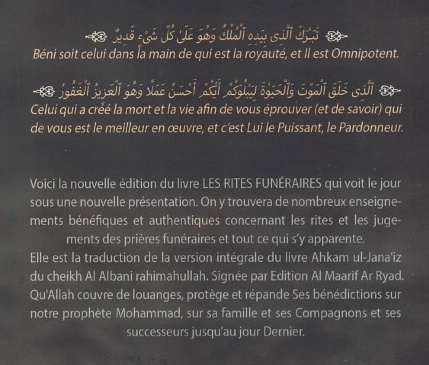 Ce livre est une traduction complète de l'ouvrage Ahkam ul-Jana'iz du défunt cheikh Al Albani, que la miséricorde d'Allah soit sur lui. Il est édité par Al Maarif Ar Ryad. Que Dieu accorde Ses bénédictions à notre prophète Mohammad, à sa famille, à ses compagnons et à ses successeurs jusqu'au Jour Dernier.