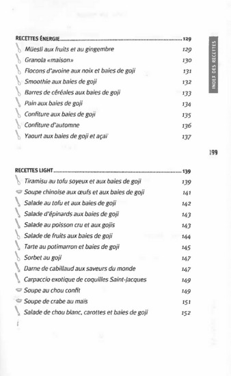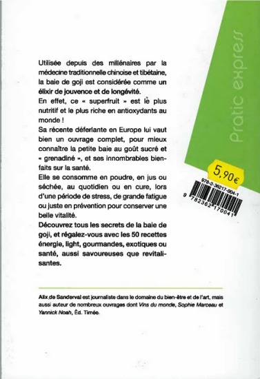 Utilisée depuis des millénaires par la médecine traditionnelle chinoise et tibétaine, la baie de goji est considérée comme un élixir de jouvence et de longévité. En effet, ce " superfruit " est le plus nutritif et le plus riche en antioxydants au monde ! Sa récente déferlante en Europe lui vaut bien un ouvrage complet, pour mieux connaître la petite baie au goût sucré et " grenadiné ", et ses innombrables bienfaits sur la santé. Elle se consomme en poudre, en jus ou séchée, au quotidien ou en cure, lors d'une période de stress, de grande fatigue ou juste en prévention pour conserver une belle vitalité. Découvrez tous les secrets de la baie de goji, et régalez-vous avec les 50 recettes énergie, light, gourmandes, exotiques ou santé, aussi savoureuses que revitalisantes.