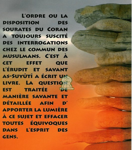 L’ordre ou la disposition des sourates du Coran a toujours suscité des interrogations chez le commun des musulmans. C’est à cet effet que l’érudit et savant As-Suyûtî a écrit un livre. La question est traitée de manière savante et détaillée afin d’apporter la lumière à ce sujet et effacer toutes équivoques dans l’esprit des gens.