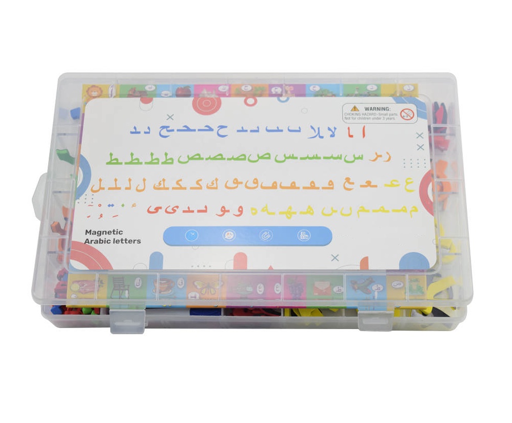 Cette mallette contient un très grand nombre de lettre et voyelles arabes magnétiques qui peuvent se fixer très facilement sur le tableau, avec toutes les combinaisons possibles afin de constituer les mots que l'on veut... Les points et les voyelles (tachkîl) sont également fournies seuls afin d'avoir encore plus de flexibilité et de possibilités d'écritures...