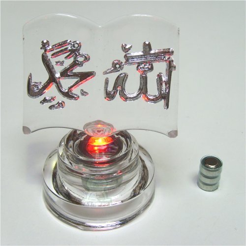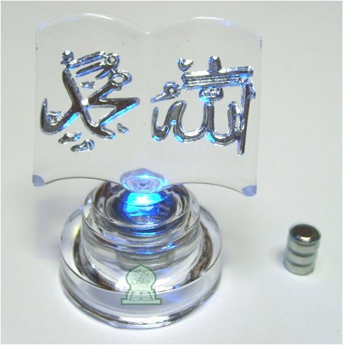 Un article de décoration portant les noms d'Allah et Mohammed (SAW) gravés en arabe sur un cristal sous forme d'un livre ouvert. Le tout avec un jeu de lumière alternant les deux couleurs rouge et bleu selon une période de quelques secondes.