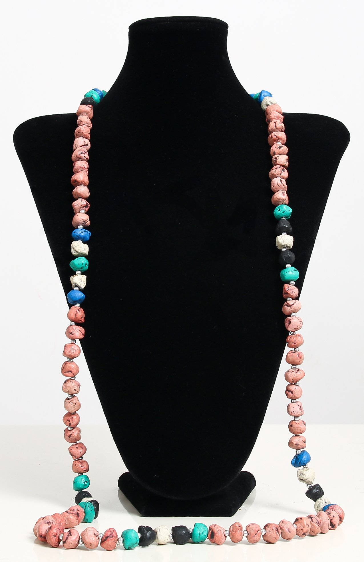 Long collier ethnique artisanal imitation pierres couleur crevette agremente de perles et autres pierres colorees