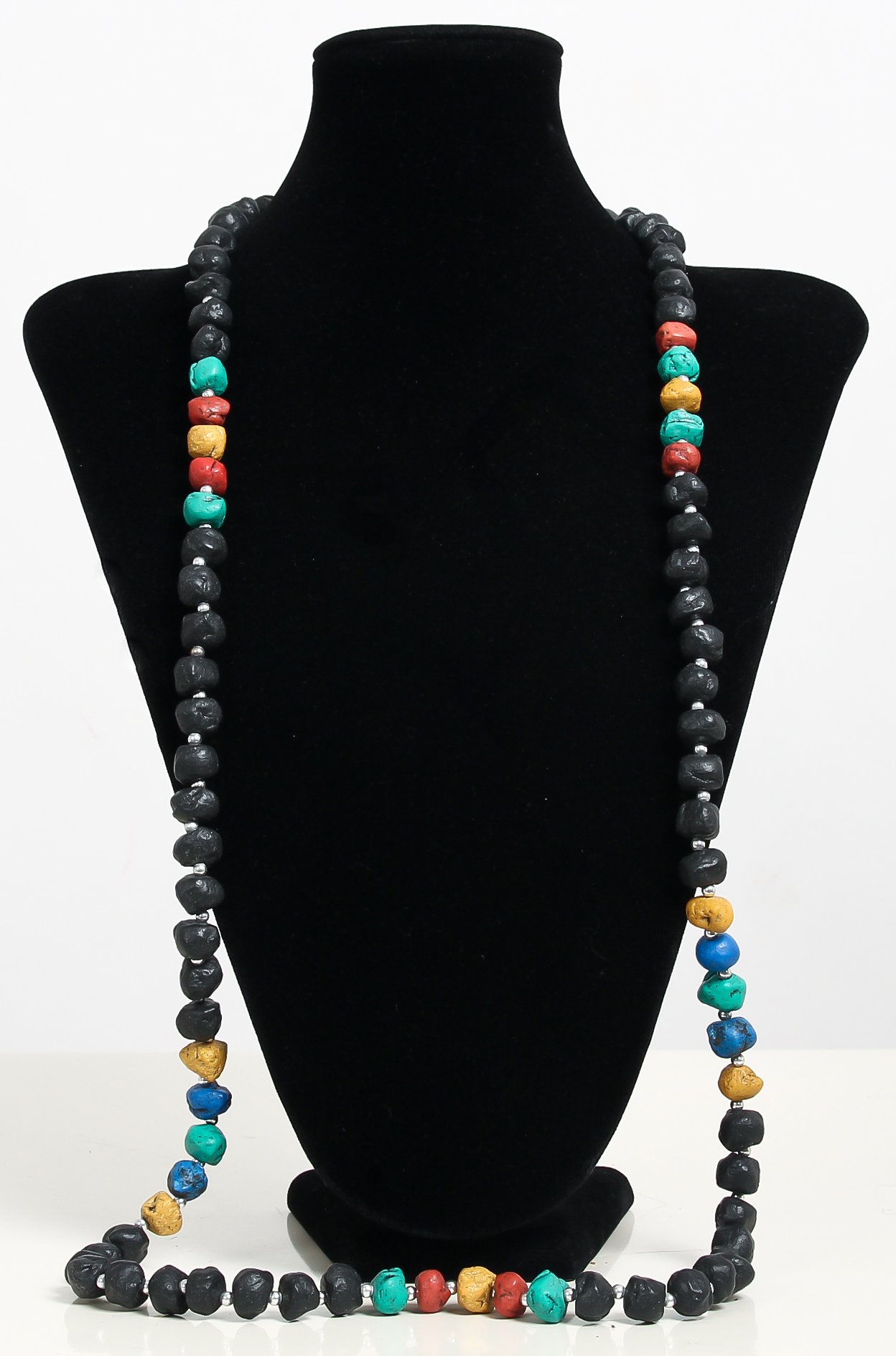 Long collier ethnique artisanal imitation pierres couleur noire agremente de perles et autres pierres colorees