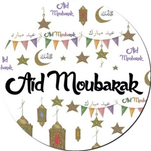 Lot de 12 grands autocollants ronds "Aid Moubarak" bilingue (français/arabe) pour Cadeaux de l'Aid - Stickers autocollants de 6 cm - REF. 28668 (1.90 €)